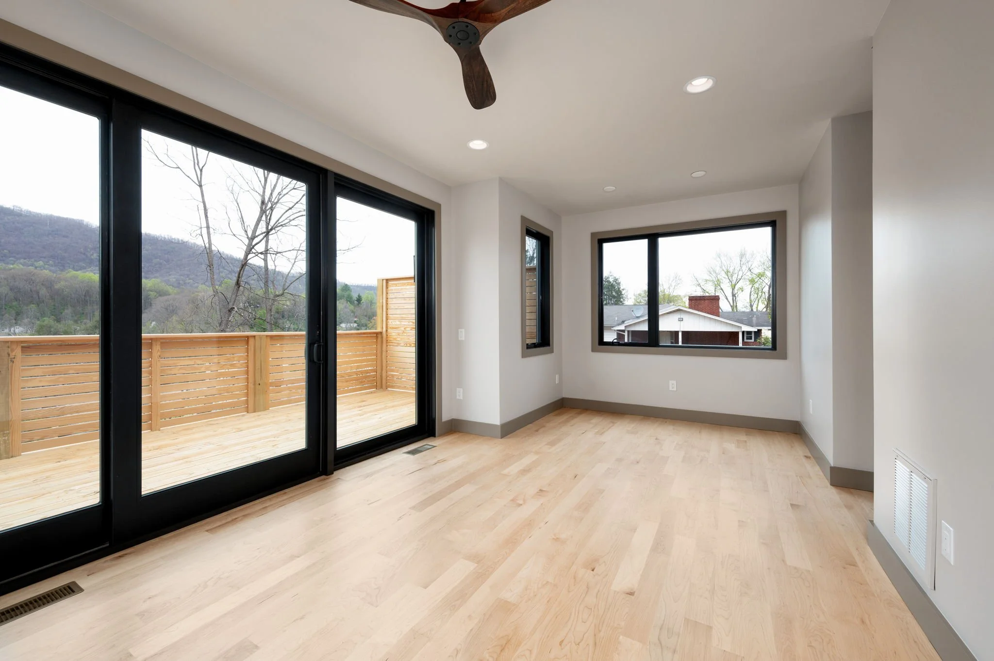 Upon entering, you're greeted by soaring ceilings and a breathtaking glass chandelier, visible both from the foyer and again as you ascend the stairs thanks to a sleek, modern glass railing. The open concept living room features a triple-pane glass wall system that folds into itself, erasing the boundary between indoor and outdoor living. The effect is that of a luxury treehouse — perched in the peaceful landscape of Western North Carolina.