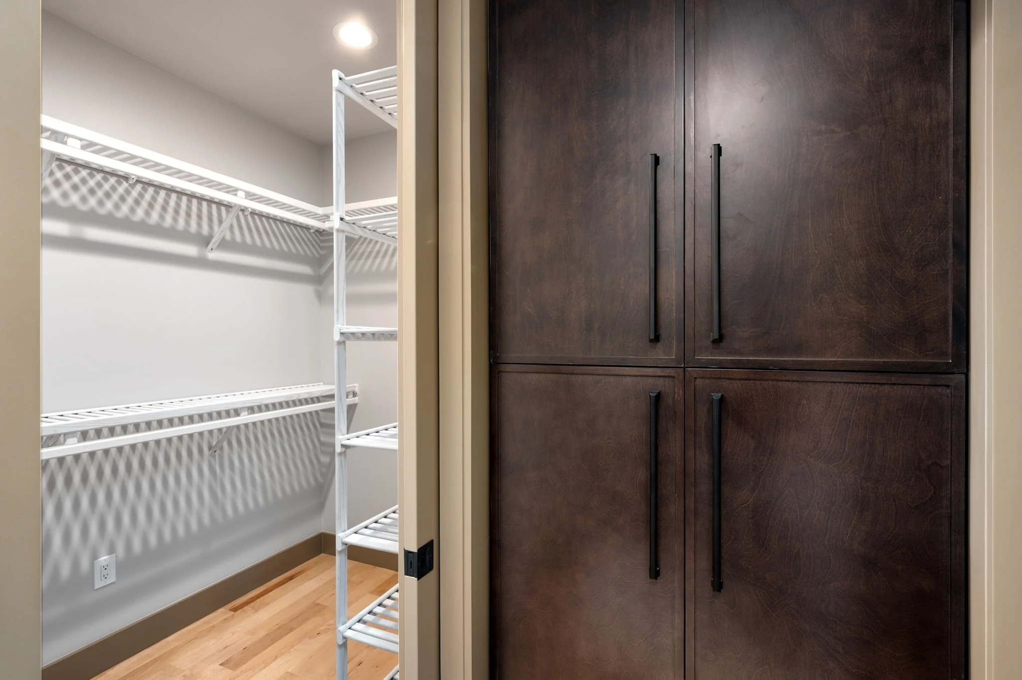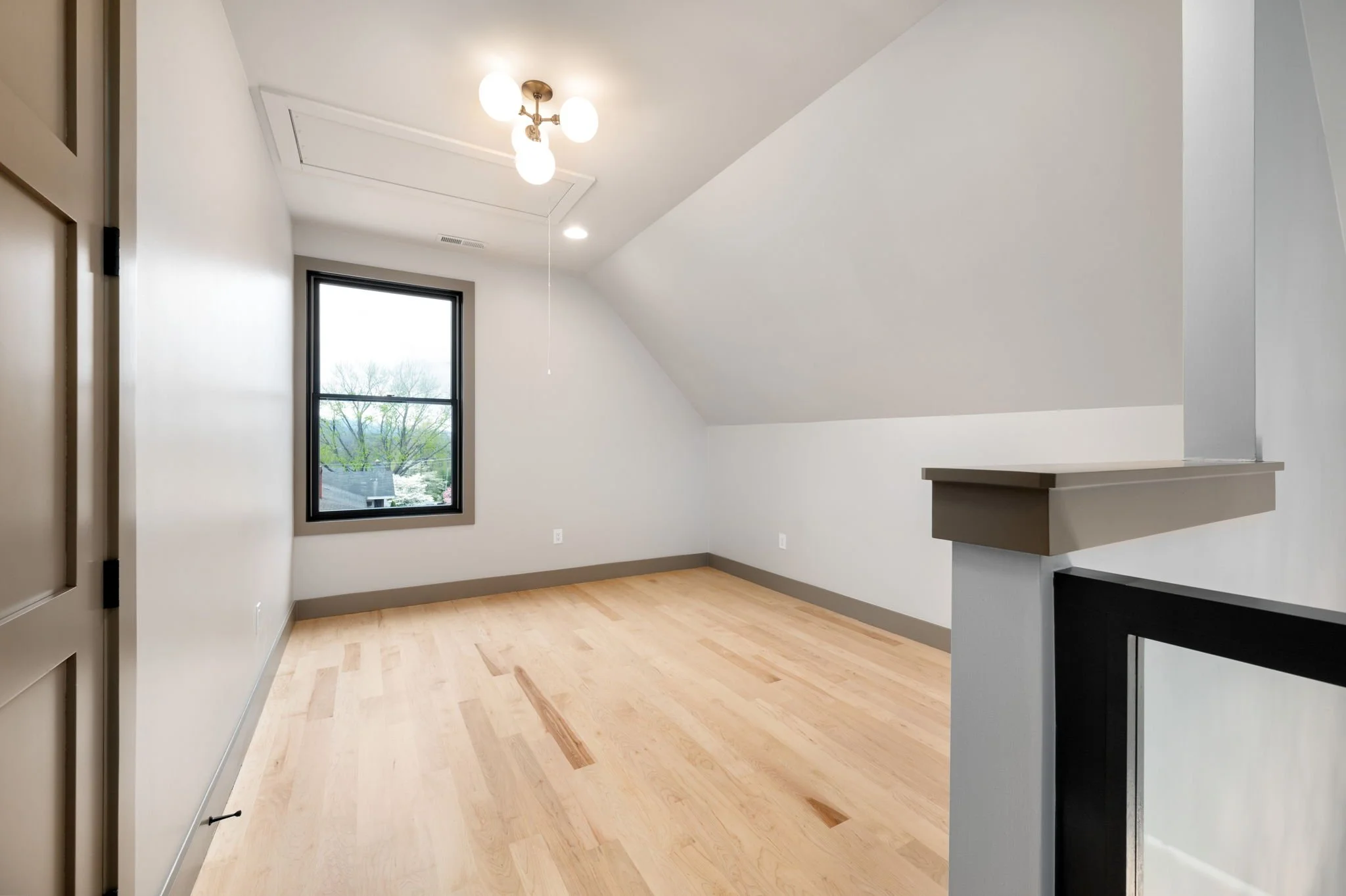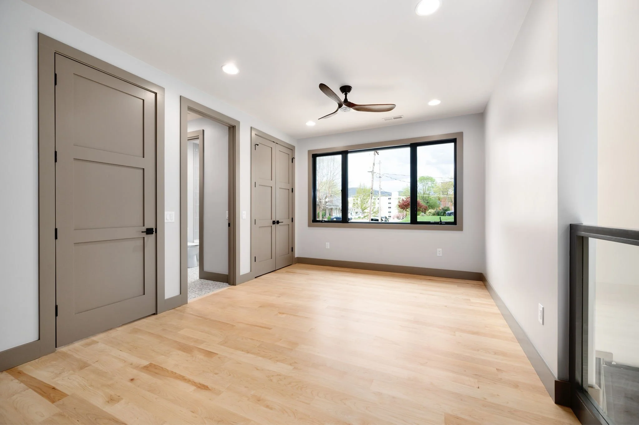 The bathroom on this level mirrors the same luxurious sensibility as the rest of the home, with 9-foot ceilings, elegant tilework, and a walk-in shower that continues the spa-like experience.