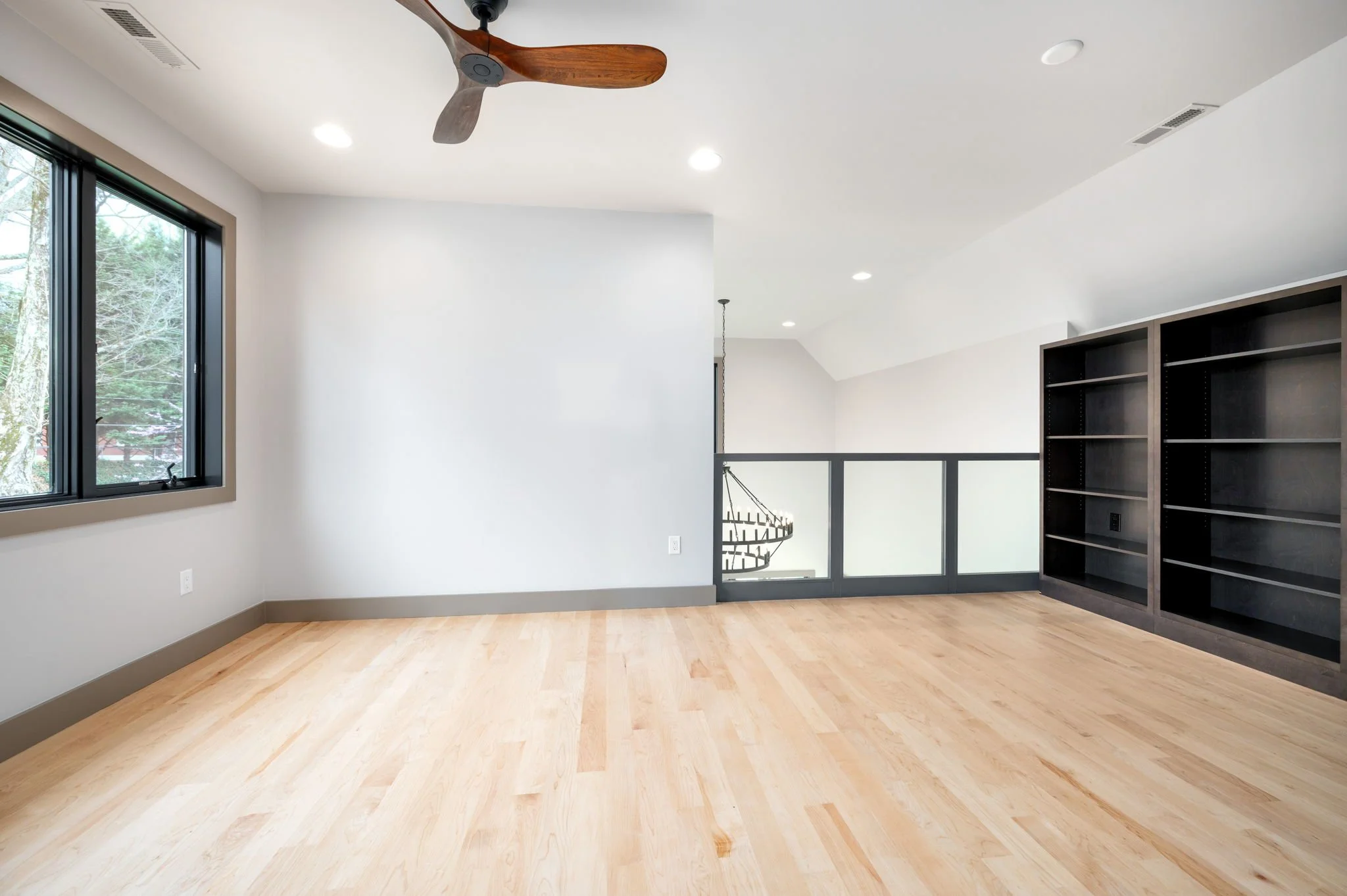 Upstairs, the loft offers a tranquil library lounge. Thanks to the use of glass railing, the space remains visually connected to the rest of the home, preserving light, flow, and that sense of openness. Western-facing windows offer long-range views and a cozy nook for reading or relaxing.